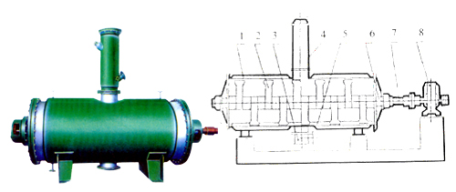 具有結構簡單,操作方便,使用周期長,性能穩定可靠,蒸汽耗量小,適用性能強,產品質量好,特別適用于不耐高溫、易燃、調溫下易氧化的膏狀物料的干燥,該機經用戶長期使用證明是一良好的干燥設備。原理:被干燥物料從殼體上方正中間加入,在不斷正反轉動的耙齒的攪拌下,物料軸向來回走動,與殼體內壁接觸的表面不斷更新,受到蒸汽的間接加熱,耙齒的均勻攪拌,粉碎棒的粉碎,使物料表面水分更有利的排出,氣化的水分經干式除塵器、濕式除塵器、冷凝器,從真空泵出口處放空。結構:真空耙式干燥機的主要部件。